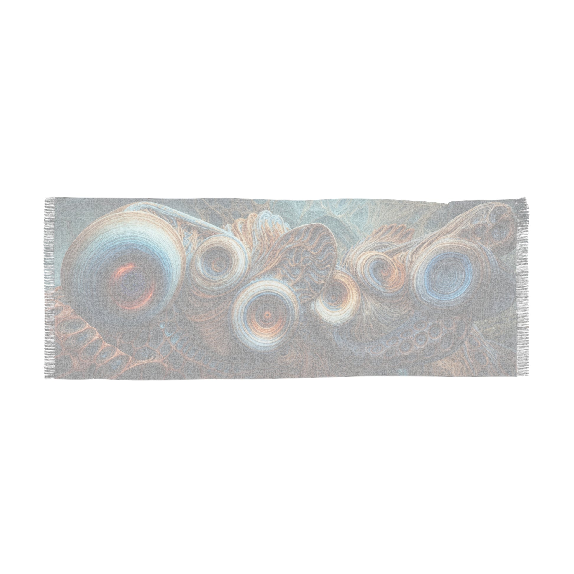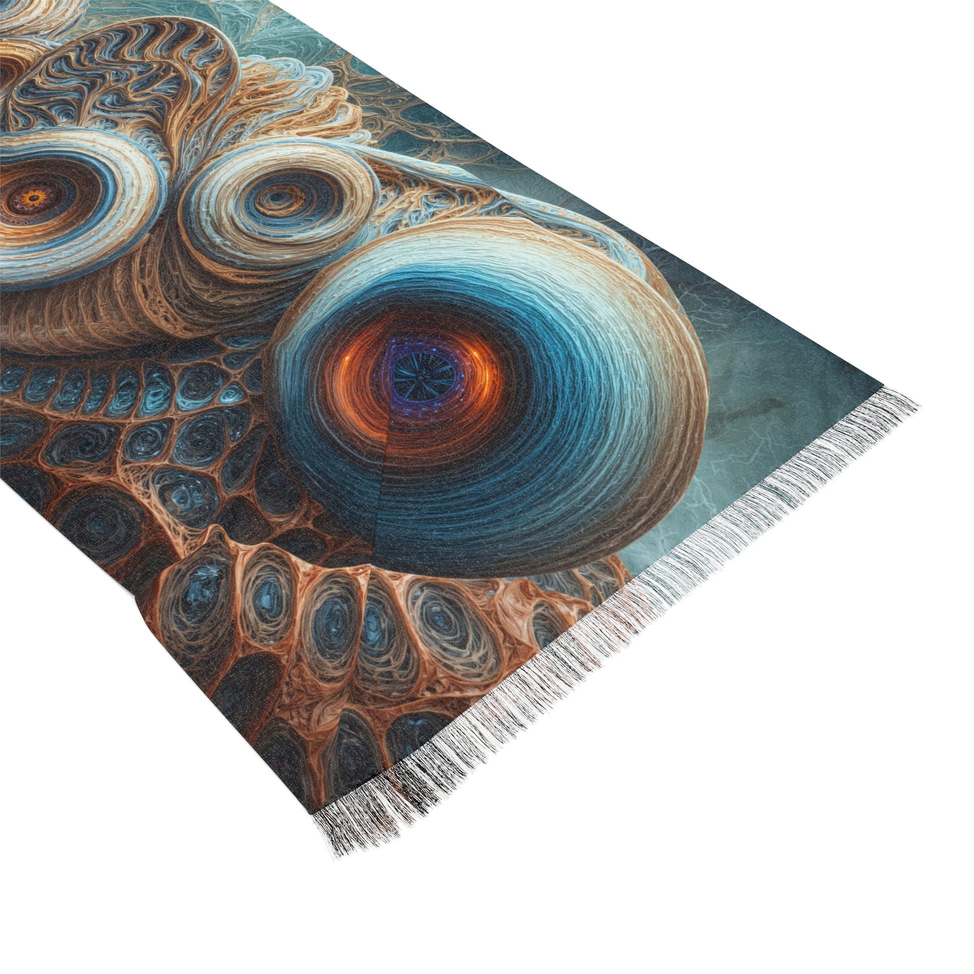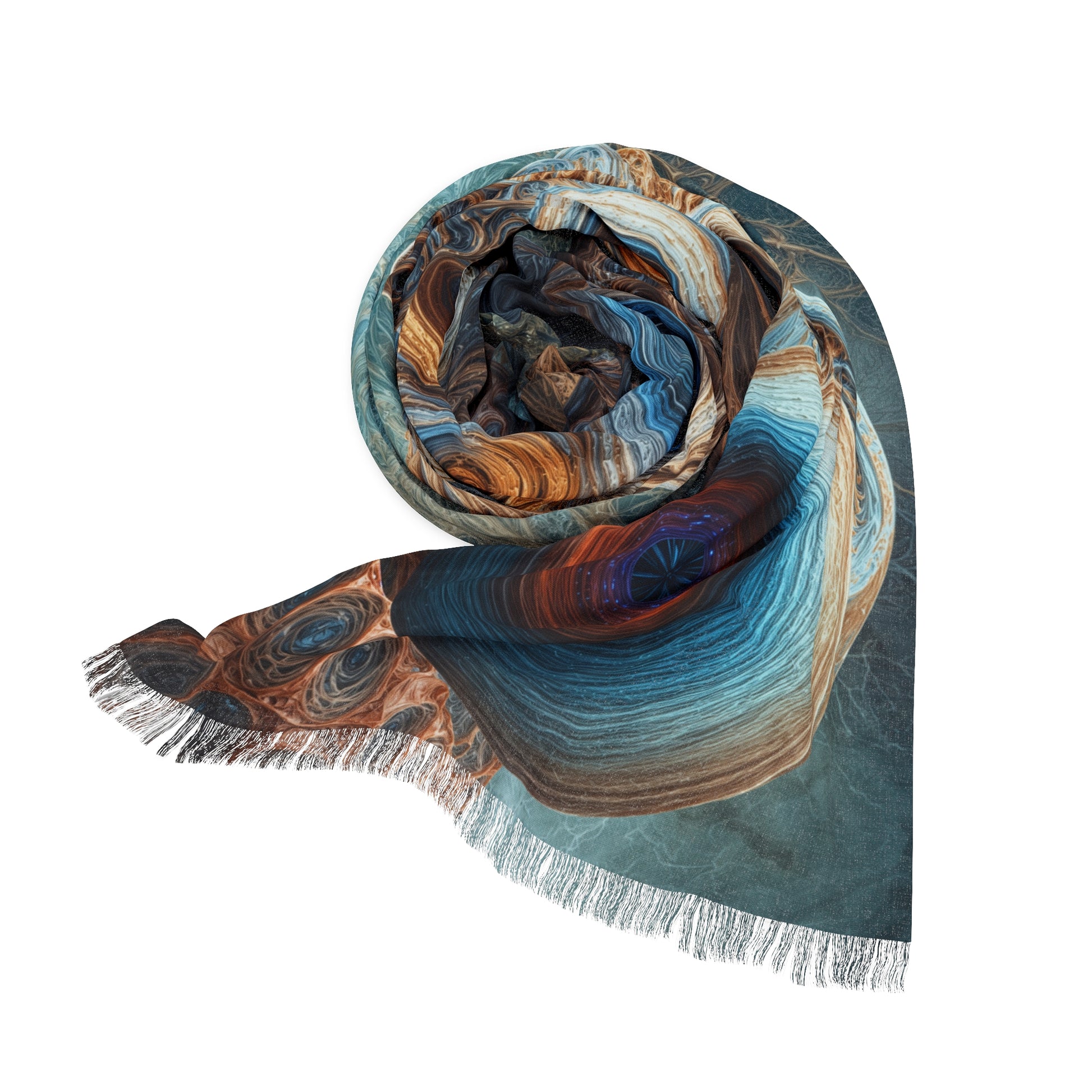 Discover a tapestry of boundless evolution, where swirling azure and deep umber hues weave a narrative of infinite metamorphosis. As the delicate fibers of this light scarf caress your skin, feel the enchanting motifs guide you through labyrinths of imagination, elevating your consciousness to new dimensions.