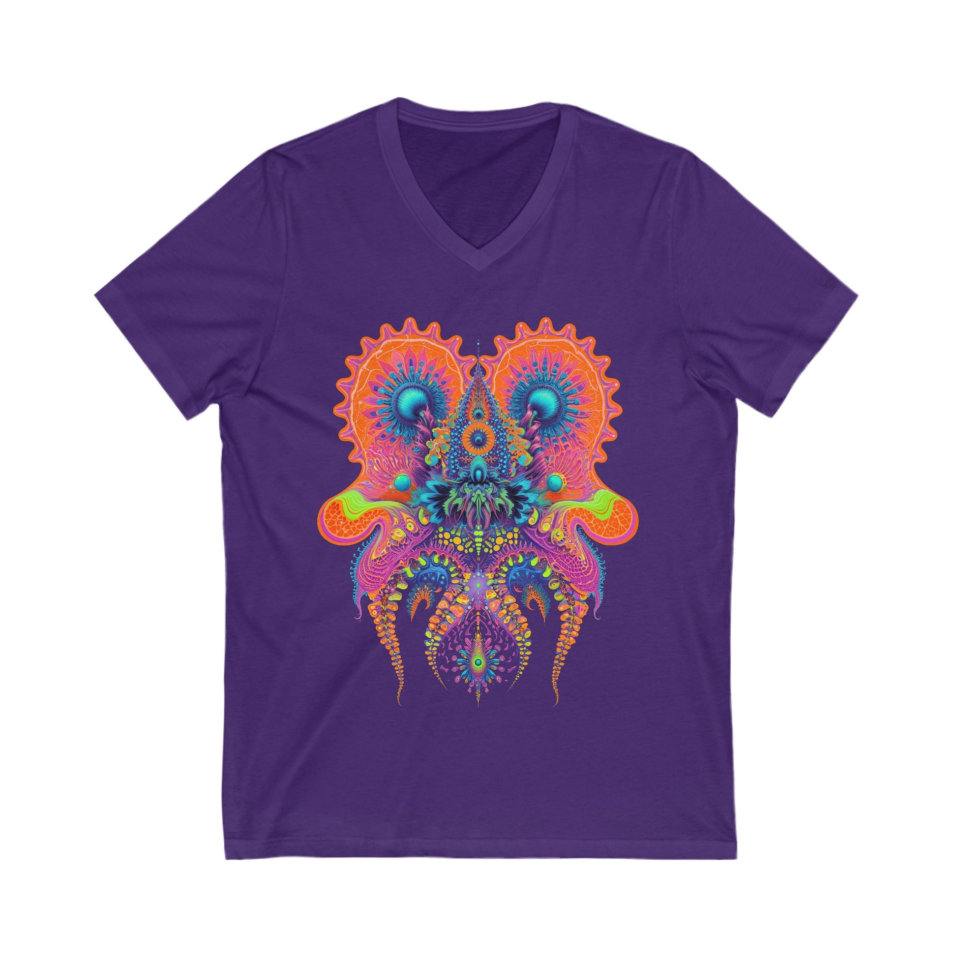 Slip into the pulse of transformation with this unisex V-neck tee. Dream Engine Chrysalis embodies the cocoon of possibility, where thought and energy entwine to form new realities. Each thread hums with unseen rhythms, guiding you through veils of perception toward the awakening that waits within.