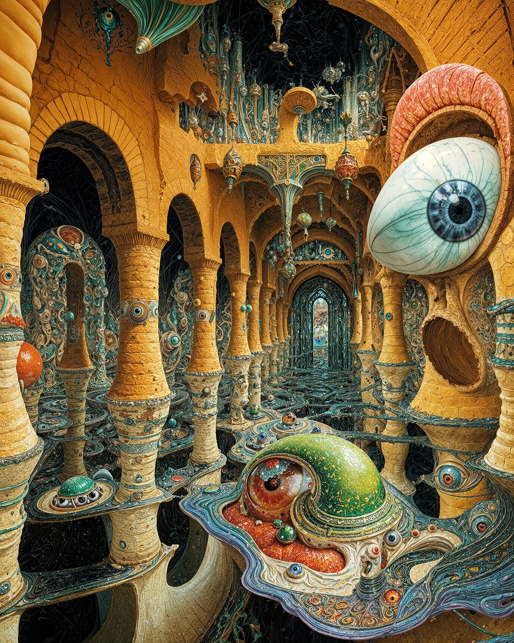 Spirewoven Canticles summons you into a vaulted labyrinth of golden arches and watchful orbs, each curve pulsing with layered echoes of ancient architects and seers. Ochre columns entwine with teal whispers to wrap your space in a tapestry of temporal dance and unfolding wisdom.
