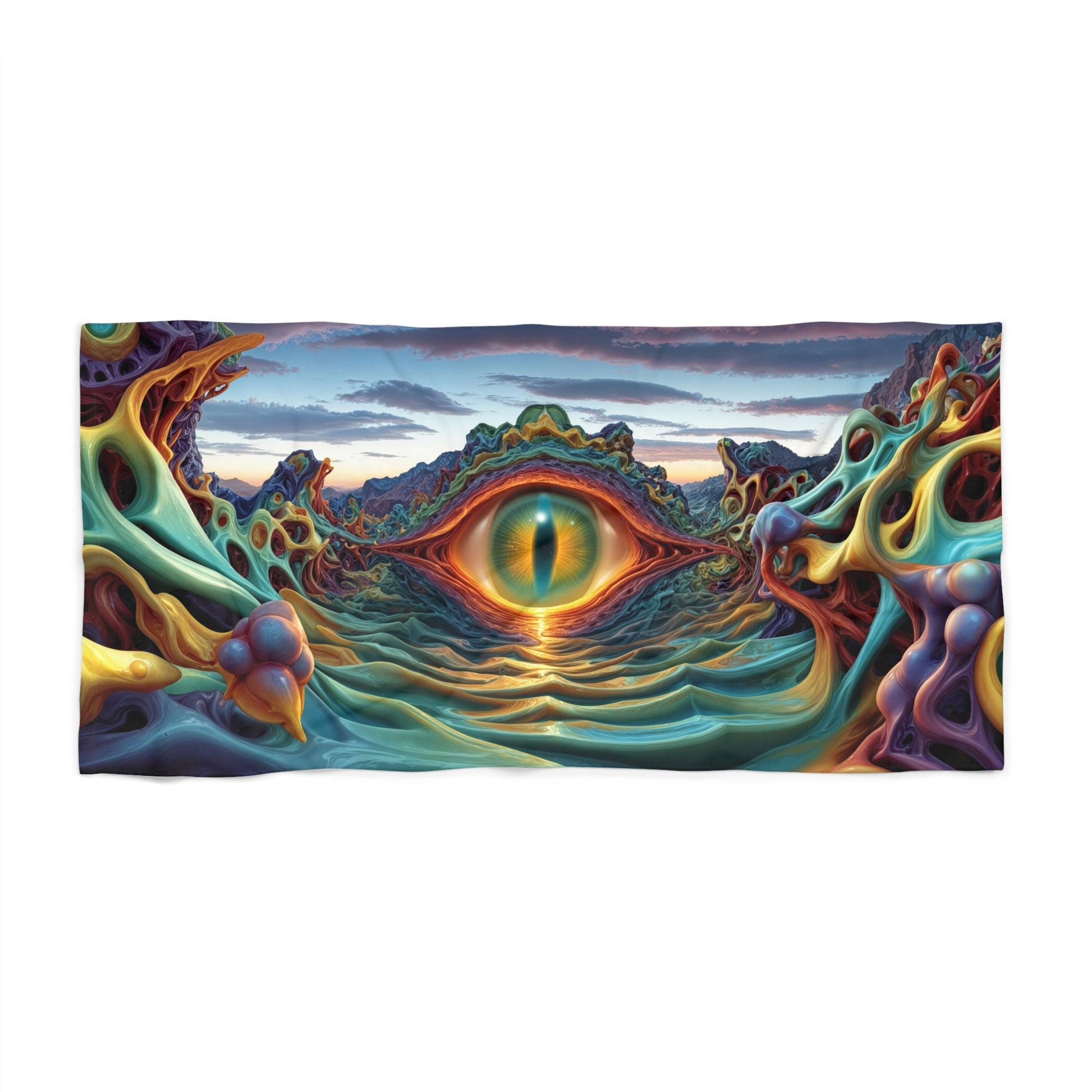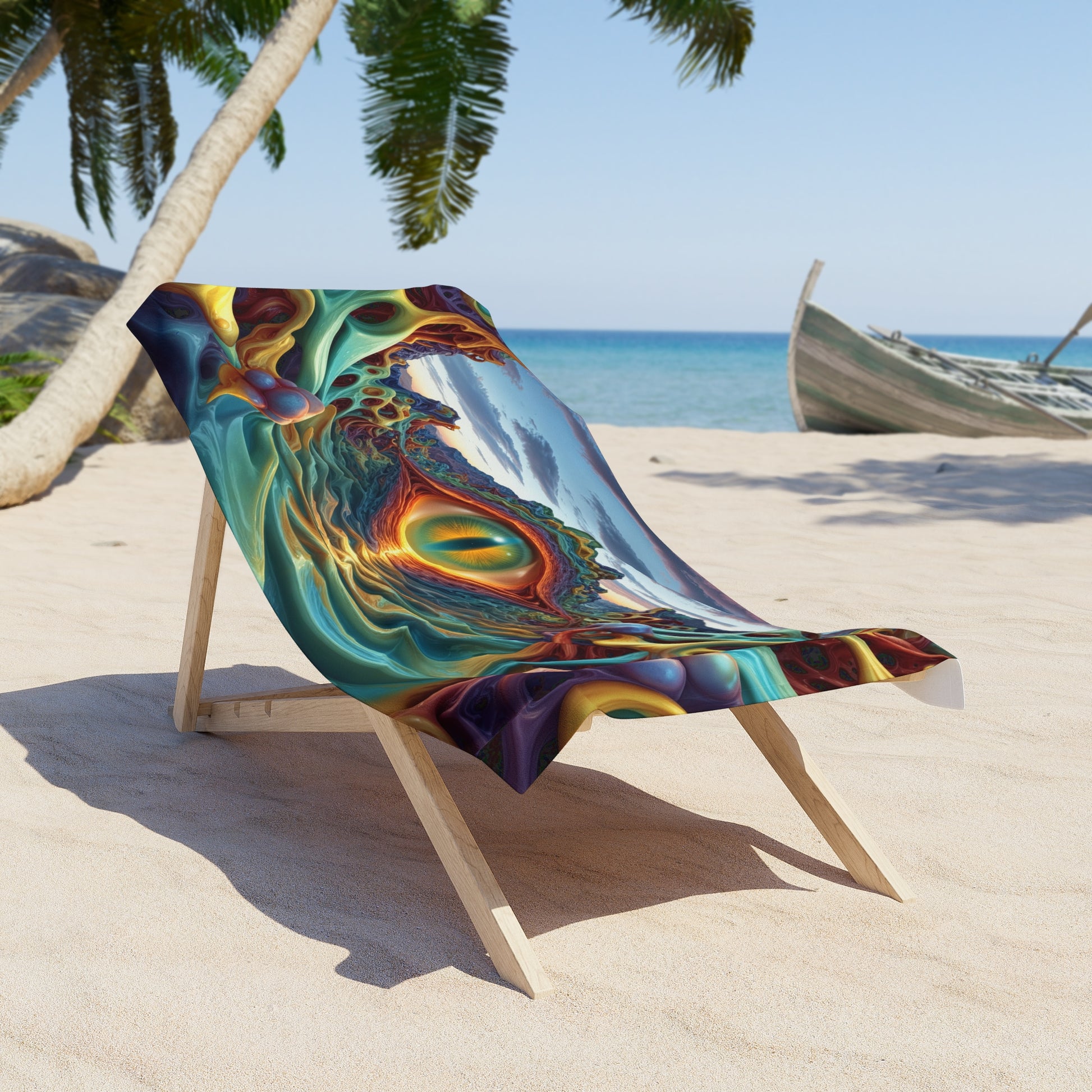 Breathe in the whispers of ancient tides as this beach towel envelops you in a kaleidoscope of swirling colors and fluid shapes. The vivid eye at the center becomes a mirror to your spirit, guiding you through rituals of introspection beneath a sky painted in serene blues and sunset hues. Engage in your sacred practice with the woven embrace of this mystical tapestry, as the very fabric hums with the echoes of your soul's journey.