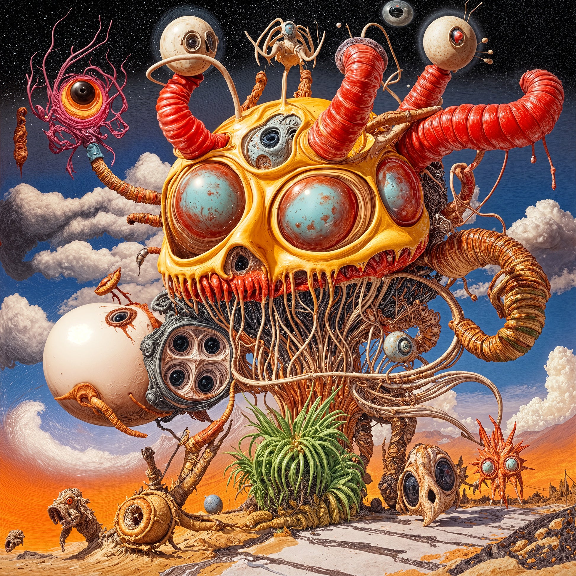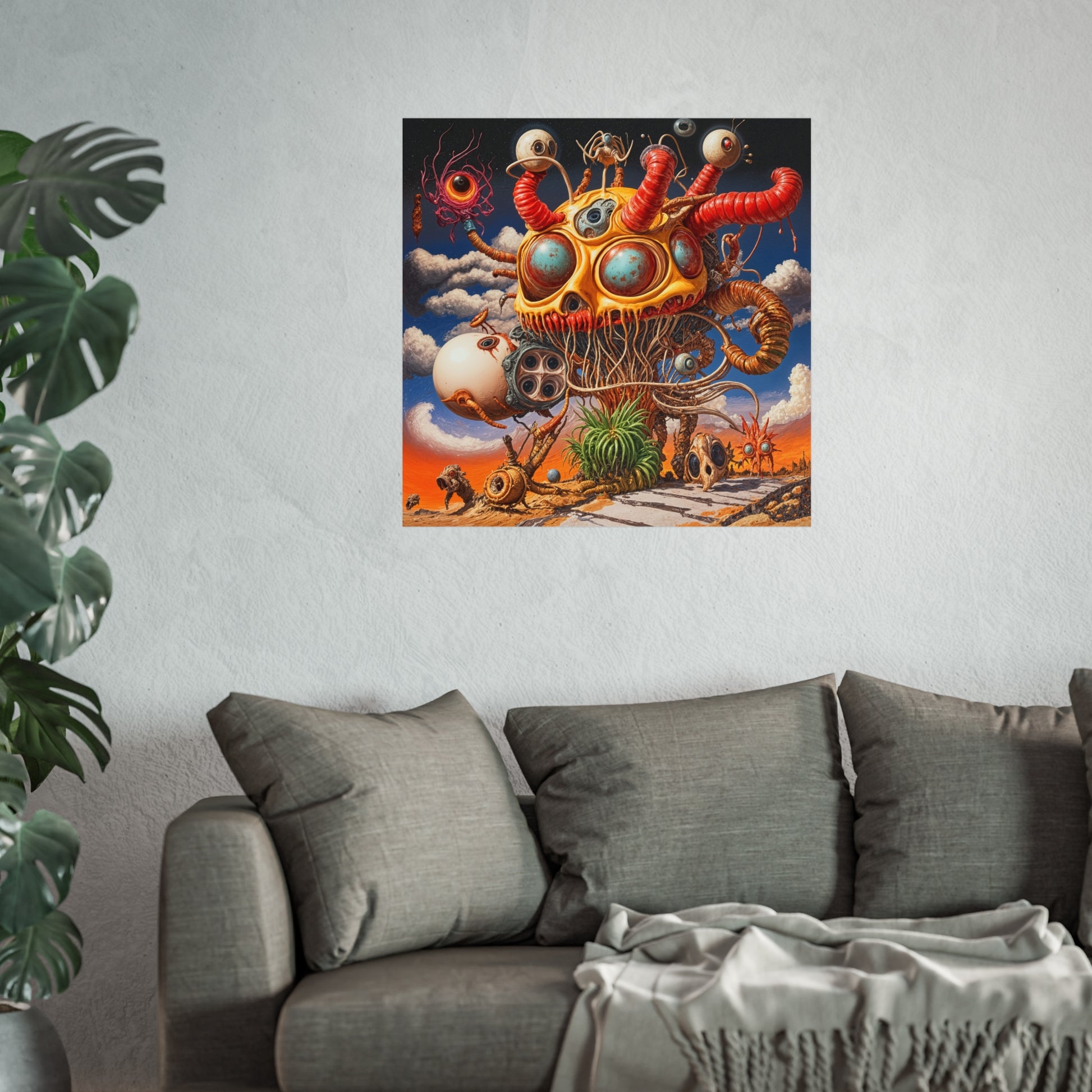 Beneath a twilight of cerulean and ember, Mycelial Skyforge emerges as a living monument of spore-forged wisdom, its mycelial tendrils stretching skyward in molten arabesques. Each swirling filament pulses with echoes of buried forests and crystalline spores, weaving a tapestry of arcane remembrance. Hang this ritual of fungi and flame to transform any wall into a consecrated gateway, where every glance uncovers the hidden cadence of growth and decay.