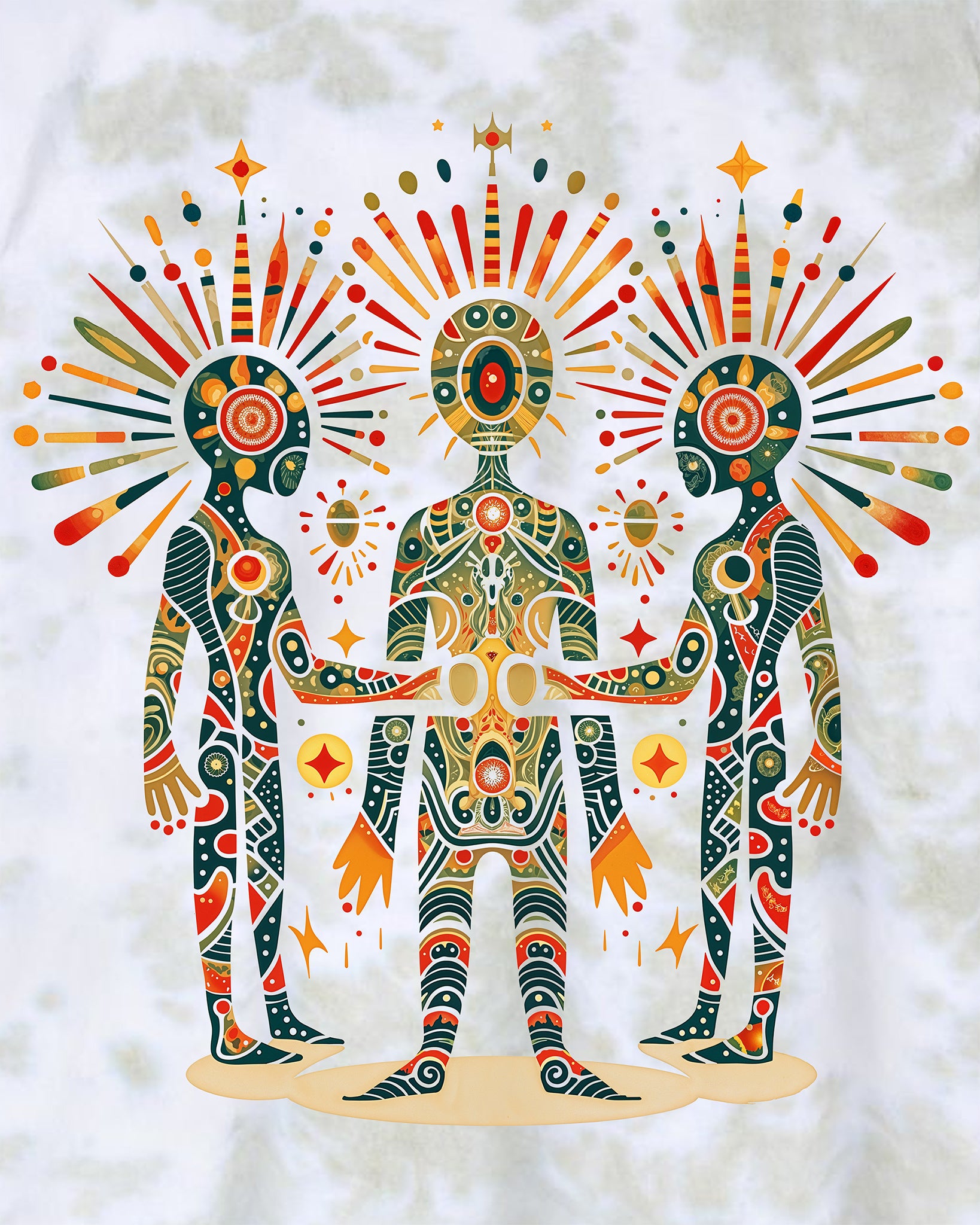 Trinity of Light wraps you in an alchemy of olive greens, molten oranges, and solar golds, each swirl tracing a path toward new horizons. This tie-dye top becomes a living map of wanderlust, its unique patterns guiding your spirit through unseen passages. Wear it as a talisman of unity and adventure—where every ripple ignites the call to explore.